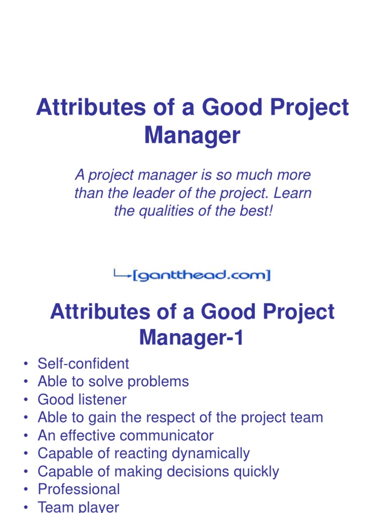 Being a good leader means that you can motivate your team to work to the best of their ability throughout the project. There are several qualities that effective project managers share that increase their overall success in leading and managing projects and teams. Qualities of a great project manager in addition to being familiar with multiple cultures and demonstrating a willingness to voice concerns on behalf of both their teams and their employers, great project managers have other invaluable qualities that tend to make them stand apart from their peers. In this post, you'll see the characteristics and soft skills that make a good project manager. Assuming your team knows it all and requires no regular training and education can result in business failure. Project managers are ultimately responsible for the results of every job they oversee, and they can only be successful by effectively coordinating and facilitating the success of their team members. A great project manager will set the tone for the project and provide a clear vision about its objectives for the team. General management skills include every area of management from accounting to strategic planning, supervision, personnel administration and more. The project manager must clearly explain the project goals as well as each member's tasks, responsibilities, expectations and feedback. In many ways, the project manager sets the standard for the rest of the team to follow and the best leaders are those who others feel they are able to trust, due to the fact that they consistently behave in an ethical and responsible way. More accurately, they are a must have for any ambitious and productive project manager: A strong team even the best project manager in the world isn't likely to be able to deliver completed projects on time without the support of a strong team. Certain traits and abilities distinguish the more successful project managers.